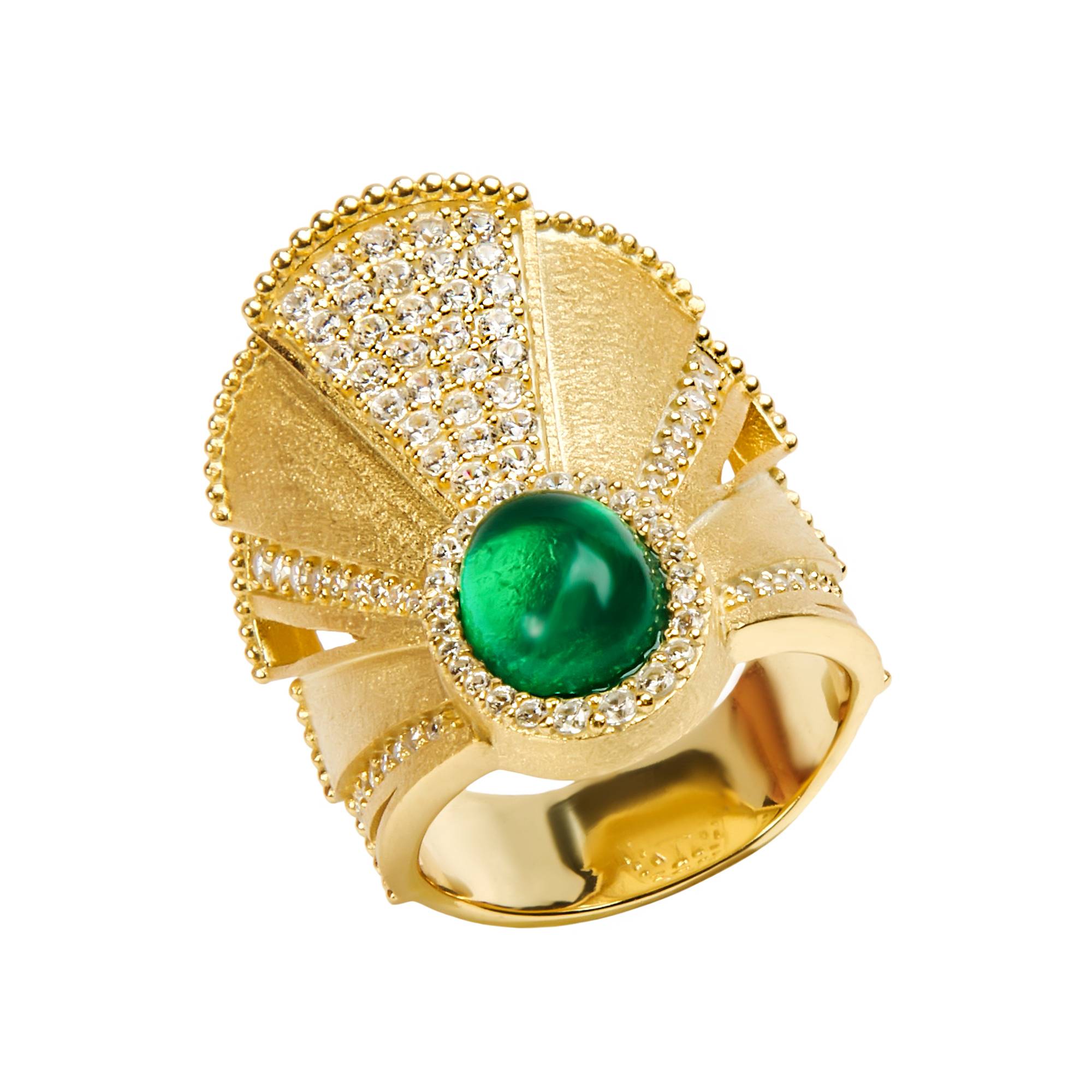 Кольцо Etruria medi из серебра 925 с покрытием желтым золотом — броский аксессуар с винтажным дизайном. Своим роскошным видом вещь напоминает старинные этрусские украшения, усыпанные драгоценными камнями. Верхушка изделия выполнена в форме веера со вставкой из зеленого стекла. Кольцо богато инкрустировано кубиком циркония, придающего ему искристый блеск. Обработка в технике diamanti добавляет сияния, создавая праздничное настроение. Благодаря этим решениям аксессуар выглядит нарядным и броским. Изделие крупное — 2,3 × 3 см, но при этом оно не выглядит массивным.